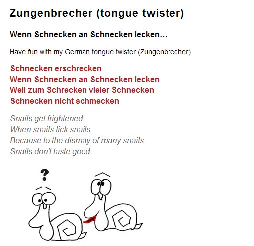 German Tongue Twisters German Course1. Wenn Fliegen hinter Fliegen fliegen, fliegen Fliegen hinter Fliegen her. If flies fly behind flies, then flies fly after flies. Brautkleid bleibt Brautkleid und Blaukraut bleibt Blaukraut. A wedding dress will always be a wedding dress and red cabbage will always be red cabbage. Fischers Fritze fischt frische Fische Frische Fische fischt Fischers Fritze. Fritz, the fishermans son, fishes for fresh fish For fresh fish fishes Fritz, the fishermans son. Pic/81edc363-ce64-11e5-a61d-003048d50275.jpg' alt='Deutsche Zungenbrecher Pdf' title='Deutsche Zungenbrecher Pdf' />Der Cottbuser Postkutscher putzt den Cottbuser Postkutschkasten. The Cottbus postal coach driver cleans the Cottbus postal coach chest. Im dichten Fichtendickicht sind dicke Fichten wichtig. In the thick spruce thicket thick spruces are important. Am Zehnten Zehnten um zehn Uhr zehn zogen zehn zahme Ziegen zehn Zentner Zucker zum Zoo. On October 1. 0th at 1. Learn German with our tongue twister, Download the free PDF on http Are you faster 15 deutsche Zungenbrecher Duration 313. Zungenbrecher in 107 Sprachen ca. Zungenbrecher sowie Zungenbrecher in verschiedenen Sprachen. Der dicke Dachdecker deckt Dir dein Dach, drum dank dem dicken Dachdecker, dass der dicke Dachdecker Dir Dein Dach deckte. The fat roofer tiles your roof, so thank the fat roofer, that the fat roofer tiled your roof. Into Concurrent Program. Es sprach der Herr von Rubenstein, mein Hund der ist nicht stubenrein. So spoke Mr. von Rubenstein, my dog, hes not housebroken. Schnecken erschrecken Wenn Schnecken an Schnecken lecken Weil zum Schrecken vieler Schnecken Schnecken nicht schmecken. Snails get frightened When snails lick snails Because to the dismay of many snails Snails dont taste good. Es klapperten die Klapperschlangen, bis ihre Klappern schlapper klangen. The rattlesnakes rattled until their rattles sounded weaker. It was fun for me to make this video. But it also took a lot of time until I had everything without mistakes. For me the most difficult tongue twister was the second one. Now That&Amp'>Now That&Amp. Which tongue twisters do you know and which is your favourite oneEs hat mir Spa gemacht dieses Video zu machen. Aber es hat auch lange gedauert, bis ich alles ohne Fehler hatte. Der zweite Zungenbrecher war fr mich der schwierigste. Welche Zungenbrecher kennen Sie und welcher ist Ihr FavoritIdentity Verification In the You. Tube video description I have added a link to my steemit profile page. More angrezi german lectures on steemit About me Hello steemit Im new to this platform and this is my first post. Im very happy that Ive found this place. On steemit I want to post german lessons and some other things. Im from Germany but since 2 years now I travel live in India. Lets have a good time together. Zungenbrecher images on Pinterest. Driver Mobile Intel 965 Express more.